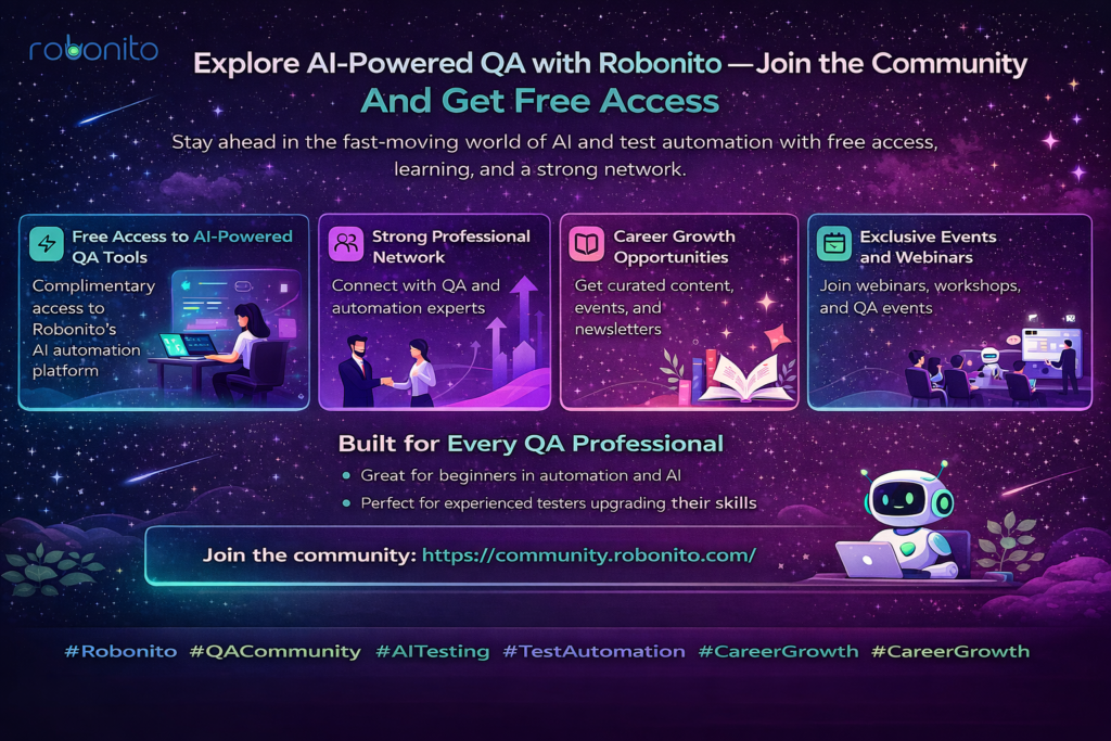 Robonito is building a collaborative ecosystem designed specifically for QA professionals who want to explore AI-powered test automation and grow their careers. By joining the Robonito QA Community, members receive free access to Robonito’s AI-driven QA automation platform, allowing them to experiment, learn, and apply AI concepts directly to testing workflows. This hands-on exposure is invaluable in a market where AI skills are becoming essential.